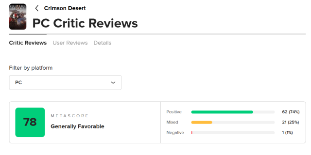19일 게임 비평 종합 웹사이트 메타크리틱에 따르면 펄어비스의 신작 '붉은사막'은 100점 만점 기준 78점의 메타스코어를 기록했다. 이는 통상 80점대 중후반에서 높으면 90점대를 기대했던 시장 전망에는 다소 못 미치는 수준으로 작품 완성도에 대한 평가가 엇갈리는 점수대로 풀이된다.