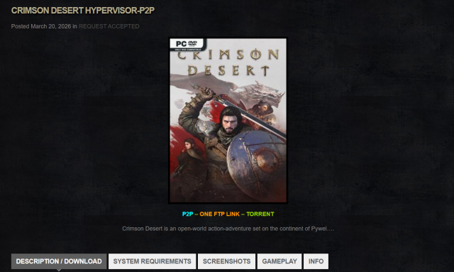 붉은사막의 크랙판도 판매량에 변수로 떠오르고 있다. 최근 업계에 따르면 붉은사막은 강력한 디지털 저작권 보호 기술로 알려진 '데누보'가 적용됐음에도 불구하고 이를 우회한 크랙 버전이 온라인을 중심으로 유통되고 있는 정황이 나타나고 있다.