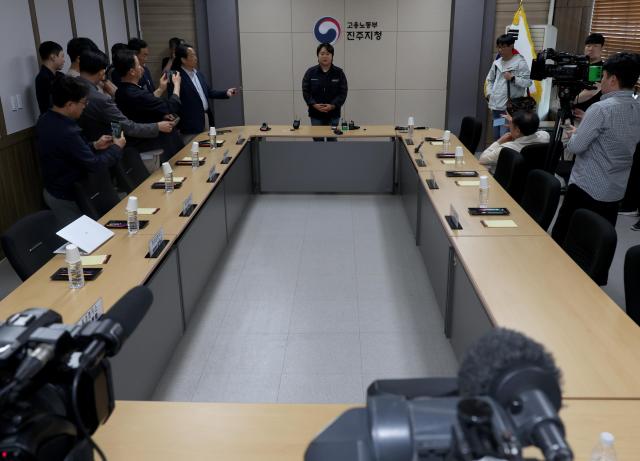 민주노총 공공운수노조 화물연대본부와 BGF로지스가 교섭 끝에 잠정 합의하기로 한 29일 오후 2시 30분께 경남 진주시 고용노동부 진주지청에서 박연수 화물연대 기획실장이 취재진에게 당초 오전 11시 예정이던 조인식이 합의서 내용 조율 등으로 지연되고 있다고 설명하고 있다. [사진=연합뉴스]